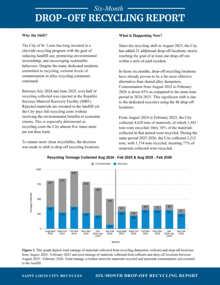 In the six months since the City of St. Louis shifted from alley recycling to drop-off recycling, contamination from August 2025 to February 2026 is down 83%, compared to the same time period in 2024-2025. In addition, the City has seen an 8% increase in materials recycled compared to the same period from 2024-2025. With the increase in the number of drop-off sites, combined with the efforts of dedicated residents, the City is diverting more trash from landfills while also reducing costs.